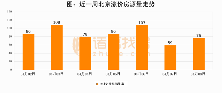 根据诸葛找房数据显示,北京24小时涨价房源量为76套,较04月07日增加17套,环比上涨28.8%。与此同时,涨价房源占比小幅扩大,业主信心有所提升。