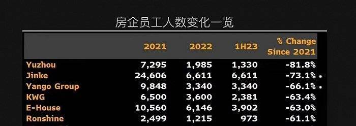降薪裁员是大多数房企采取的普遍措施。据彭博社统计,以今年上半年末对比2021年的员工数量,地产公司中人员降幅最大的五家是禹洲地产、金科、阳光城、合景泰富、融信集团,降幅都在60%以上,最高的禹洲地产达到81.8%。