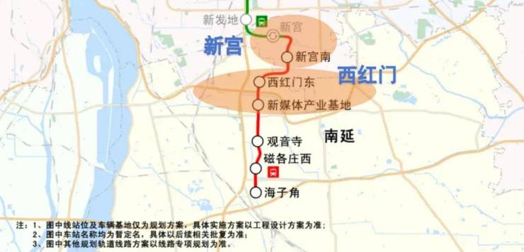 南延北起一期工程新宫站,南至大兴海子角站。串联丰台区槐新组团、大兴区西红门镇东区、大兴经济开发区、大兴新城团河组团、大兴新城东组团海子角地区。线路全长约12.7公里,全部为地下线,共设6座车站。