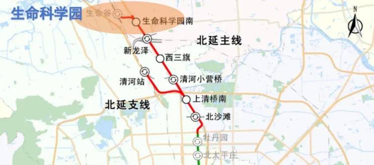 北延主线南起一期工程牡丹园站,北至昌平生命科学园南站,通过联络线衔接规划市郊铁路东北环线生命谷站。