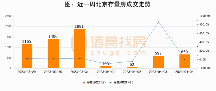 从存量房来看,2023年04月04日北京存量房单日成交659套,比昨日增加62套,环比上涨10.4%。从近一周存量房成交来看,北京存量房日均成交套数为838套,04月04日单日成交659套,低于近一周平均水平21.4%。