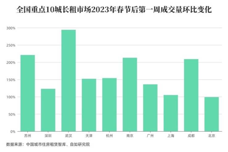 数据显示,与春节前相比,春节后第一周重点10城长租租客成交量环比提升140%。而在长租市场成交量整体呈回升趋势时,新一线城市的增长幅度明显高于一线城市。
