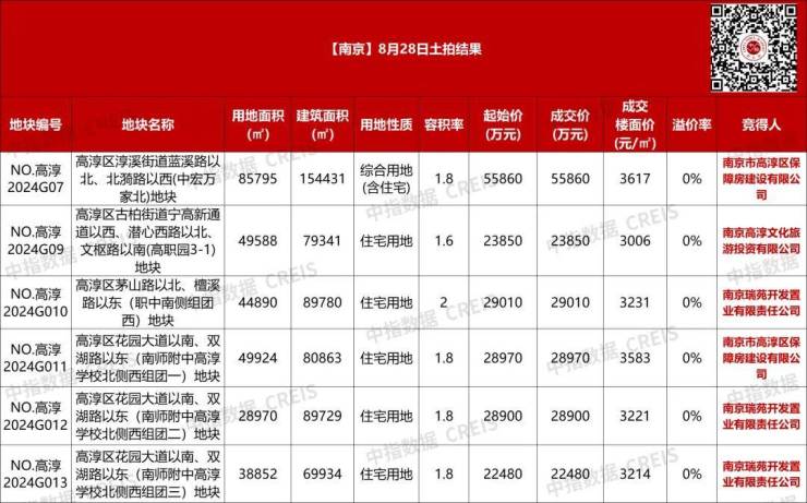 8月28日,江苏省南京市高淳区6宗涉住宅用地全部成交,用地面积合计298019平方米,起始总价约18.9亿元,最终6宗地块均底价成交,竞得人均为南京市高淳区人民政府国有资产监督管理办公室旗下的企业。其中南京市高淳区保障房建设有限公司获取2宗,江苏高淳经济开发区开发集团有限公司旗下的南京瑞苑开发置业有限责任公司竞得3宗,南京高淳文化旅游投资有限公司竞得1宗。