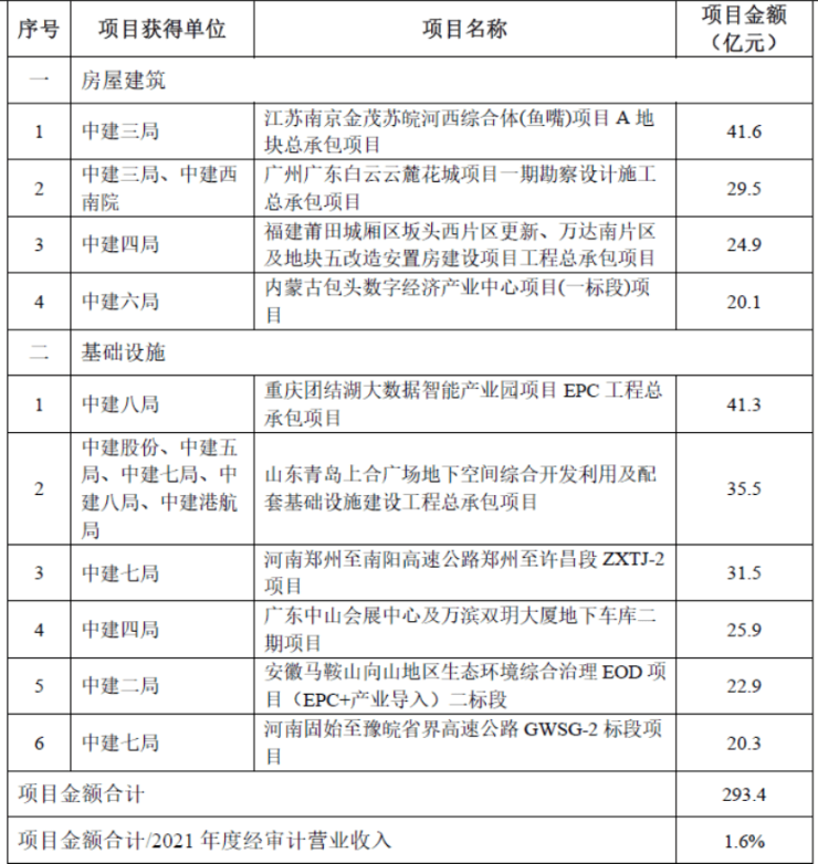 公告显示,中国建筑近期共获得10个重大项目,其中房屋建筑4个,基础设施项目6个,项目金额合计293.4亿元,占2021年度经审计营业收入的1.6%。