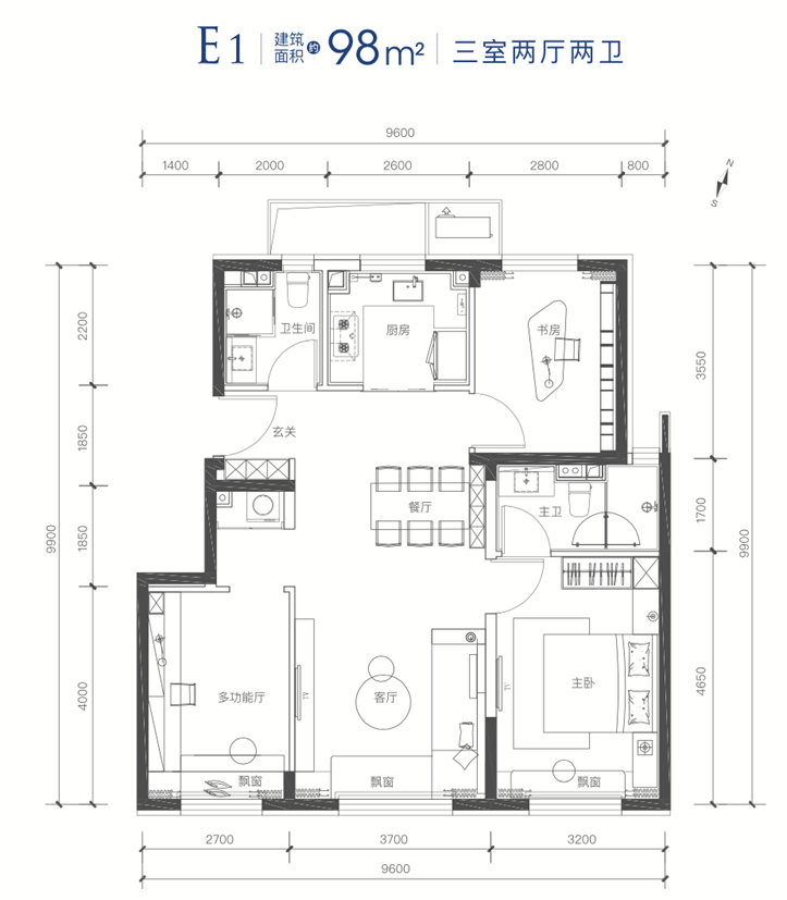 超28㎡尺度的客餐厅,招待亲友十分得体且从容;LDK客餐厨一体化设计,缩短生活动线的同时,模糊空间界限,视野毫无阻碍,阳光清风扑面而来,整体的一致性、全面性,从而形成强烈的空间感;此外,还将市面上备受青睐的三面宽应用于此,约9.6米的奢阔尺度,双卧+客厅朝南,采光通风、观景视野,都超乎想象!主卧套房超20㎡空间,奢配独立卫浴;巧妙的是,在传统三居布局之上,产品融入“三阳开泰”设计,让每个卧室都相对独立,静享生活的私密与舒适,而这样难得的好户型,仅需总价330万,即可入住。