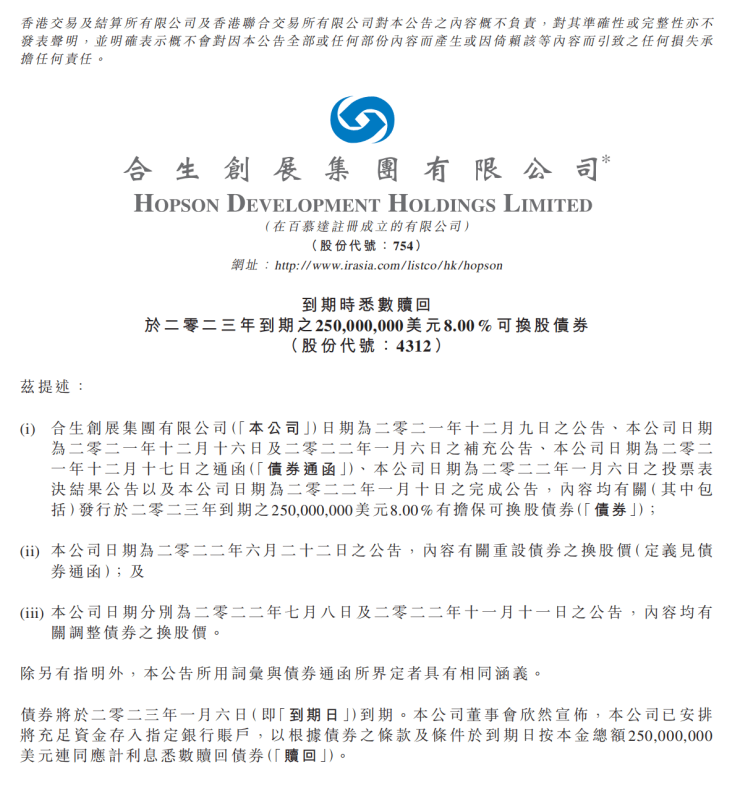 合生创展行稳致远:境外2.5亿美金可转债本息已提前到账