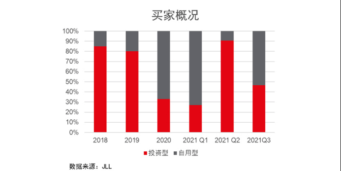 仲量联行方面分析,从投资者类型来看,机构投资者在第三季度的活跃度有所降低,成交额环比减少16%,但自用型买家在有利的市场情况下积极收购项目,占到了总成交额的53.5%。