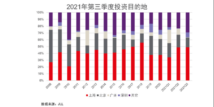 上海依然是中国内地优选的投资目的地,占第三季度总成交额的49%。北京和广州的成交三季度有所下降。深圳三季度有了明显的涨幅,占总成交量7.3%。