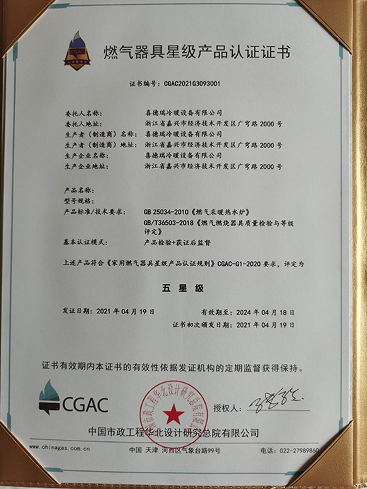 近日,在由中国燃气供热专委会等机构联合主办的2021中国燃气供热行业年会上,备受业内关注的CGAC首批燃气具星级产品认证名单正式公布,喜德瑞实力入选,且获较高等级五星级认证。