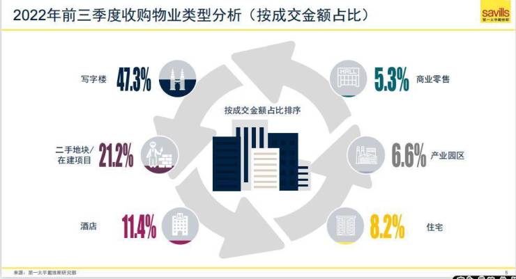 当下什么样的资产有机会套现?根据排名前列太平戴维斯统计,在今年前三季度的北京大宗交易中,按照收购物业成交金额来看,写字楼、二手地块/在建项目、酒店、住宅、产业园区、商业零售分别占比为47.3%、21.2%、11.4%、8.2%、6.6%、5.3%。