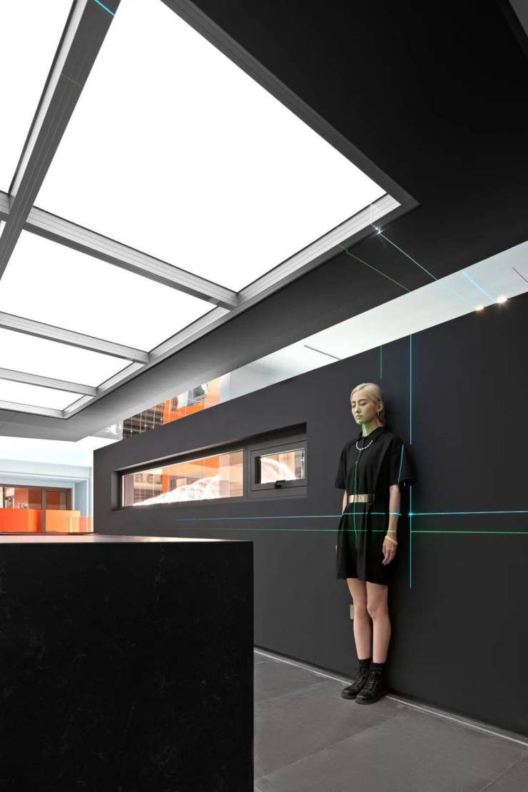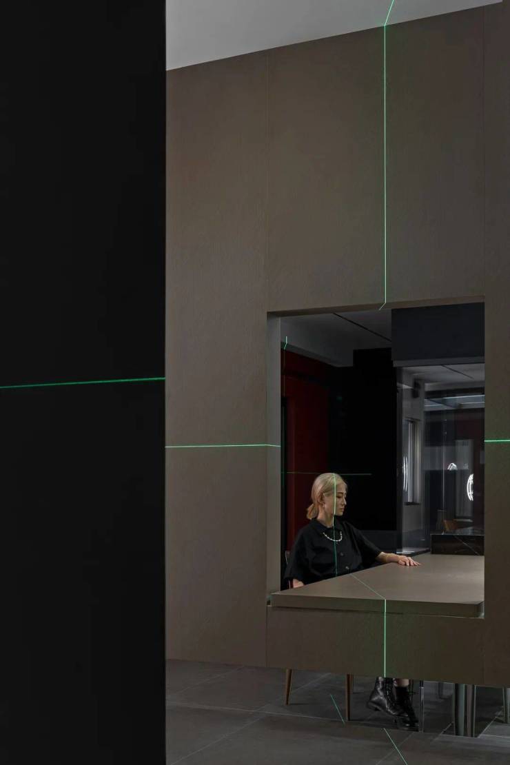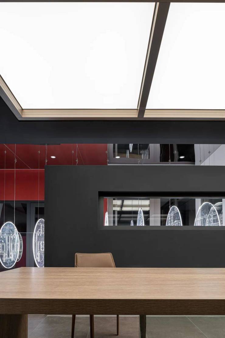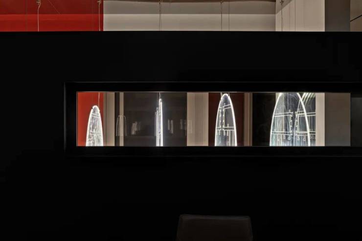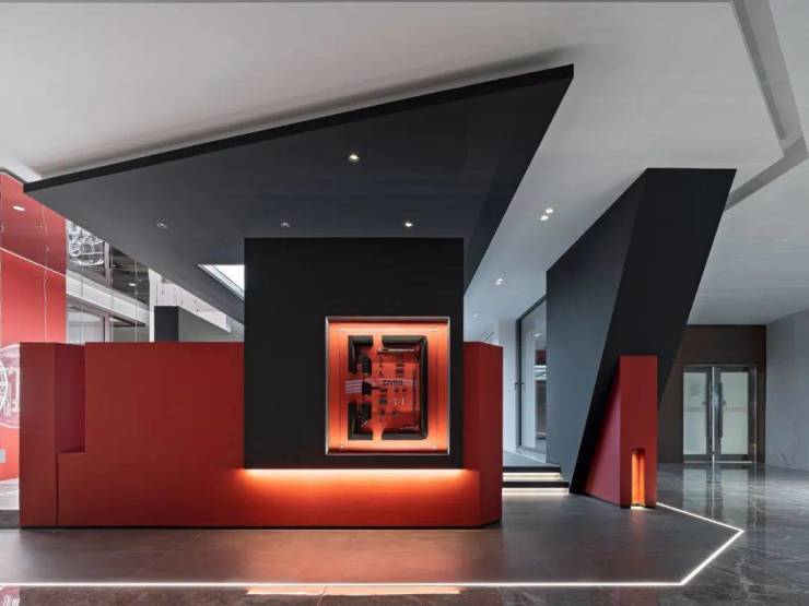 为满足产品较大优势的呈现及专业化空间尺度的视觉感官,设计师专门以门窗剖面的亚克力灯作为艺术装置进行场景氛围的渲染,在封闭的空间来进行展示,设计师别出心裁的表现手法,呈现出一个神秘感和炫酷的品牌形象,表达出企业专业展厅的品味以及韵味。