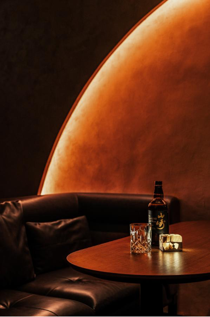 空间内 PANTONE 17-1540TPX 杏子白兰地/Apricot Brandy,不似热情的红,不张扬不媚俗,配以柔和灯光,似乎模糊了空间界限,外界的纷繁与此无关,在“落日大道”,杯酒之间都流动自己的生活的节奏。