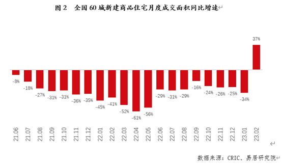易居研究院研究总监严跃进表示,本轮楼市降温始于2021年6月份,当时新房成交面积同比增速开始由正转负,为-8%。随后降速持续扩大,其中2022年4月达到了61%。后续虽有一系列稳楼市新政出台,但效果并不显著。到了2023年1月份,虽然统计的降速为34%,但若对比同样为春节月份的2022年2月,其降速已收窄至7%,市场已有了回暖的微弱迹象。到了2月份,全国60城新房首次出现积极信号,即“顽强”走出了20个月的持续下降通道,首次转正且增速达到了37%。