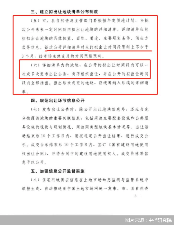 《通知》的核心要点是“推进供应信息公开”。《通知》明确,建立拟出让地块清单公布制度,每次公开详细清单对应的拟出让时间段原则上不少于3个月,给市场主体充足的时间预期限制。同时,详细清单内的地块,在公开的拟出让时间段内可以一次或多次发布出让公告,这意味着试点两年的双集中供地模式迎来转变。
