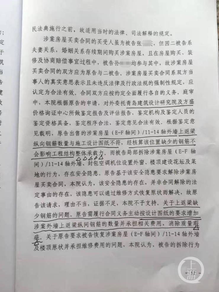 判决书载明:根据金猴房地产的申请,对外委托青岛建筑设计研究院及方盛价格询证中心所做鉴定报告及评估报告,鉴定机构及鉴定人员的鉴定资格具备,鉴定程序合法,鉴定意见合法有效。根据鉴定意见载明,涉案房屋(E-F轴间)/11-14轴外墙上返梁纵向钢筋数量与施工设计图纸不符,经核算该位置缺少的钢筋不会影响工程结构整体承载力,而孙先生局部拆除拆除涉案房屋(EF轴间)/11-14轴墙(即房屋北侧,餐厅窗台下的框架梁)、封包空调机位设置外窗、楼顶建设花坛及菜地的行为,存在安全隐患。法院认为,该安全隐患的存在,并非合同解除的法定理由,该隐患可以通过维修方式恢复原状而解决。