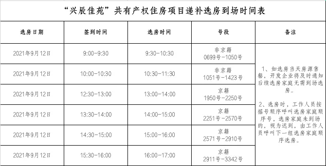 如非京籍家庭699-1423号审核通过的家庭全部选房完毕,房源还有剩余,剩余房源纳入第二组京籍1950-3342号选房,截止时间为2021年 9月12日下午17:00 。