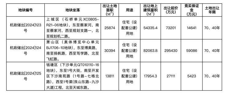 萧山区地块为杭政储出[2024]124号,即奥体博览中心单元BJ1706-10地块,该地块东至博奥路,南至扬帆路,西至笃学路,北至飞虹路。地块出让土地面积30394平方米,出让地上建筑面积82063.8平方米,出让起始价295430万元,折合起始楼面价36000元/平方米。