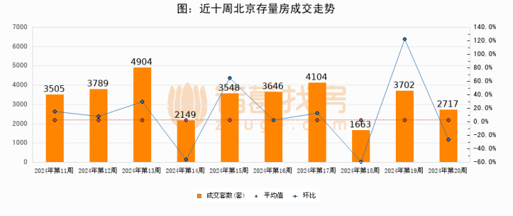 存量房方面,第20周北京存量房成交2717套,较上周减少985套,环比下降26.6%。从近十周成交走势来看,周均成交套数为3372套,本周低于平均水平19.4%。