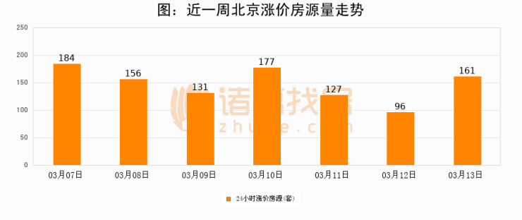 根据诸葛找房数据显示,北京24小时涨价房源量为161套,较03月12日增加65套,环比上涨67.7%。与此同时,涨价房源占比小幅扩大,业主信心有所提升。