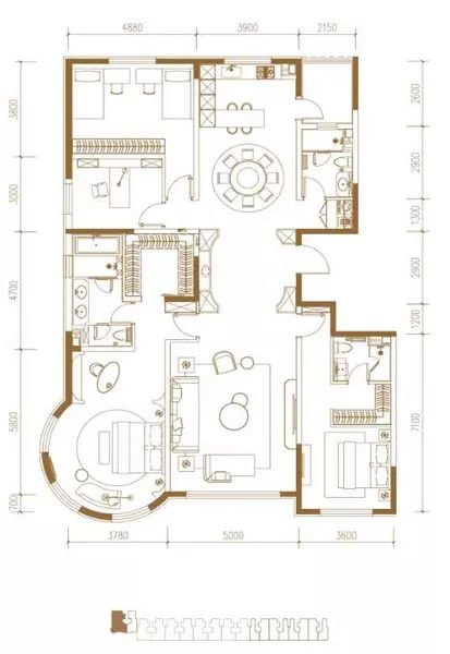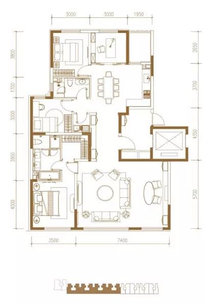 238㎡四居位于楼栋较西侧,每层也只有一户。主卧套间为半圆形设计,南向次卧带有独立卫生间和小型衣帽间,客卫服务北侧两个次卧,厨房东侧同样有部分空间或为。