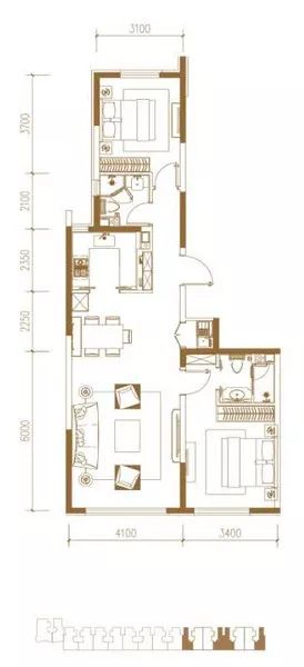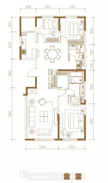 103㎡两居进深过长,只有主卧和客厅朝南,整体面宽7.5米,平均得房率82%。