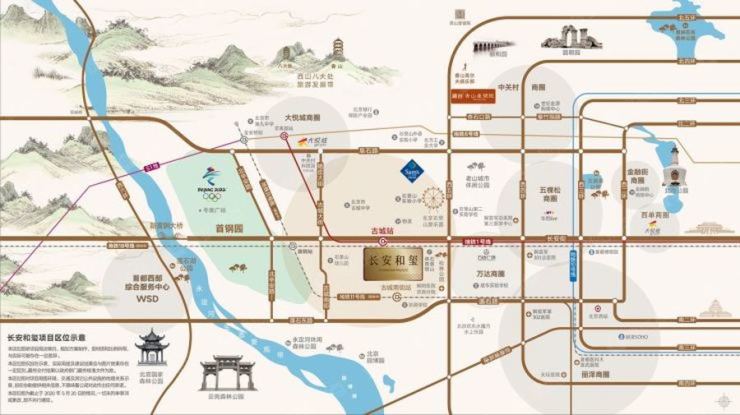 项目位于石景山古城地铁站南侧约150米。这样一看就和中海天钻离得很近,可以说是比邻而居了。两个项目可以说是共享周边的配套。