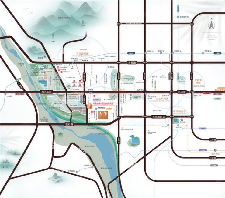 天玺位于石景山区古城南街及莲石路交叉口北500米,处在新首钢东南区板块。在项目的西侧规划有商业用地,中海将会在商业用地上建设中海国际广场,西北侧则是一片教育用地,预计将会有十分优质的教育资源被引进。