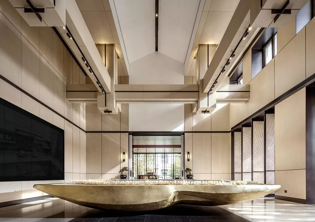 取唐风古韵为骨架,以生态为底图,借鉴现代日式,从而回溯本源,寻找东方美的源头。加入体现东方美学的榫卯结构,一折一转,极具匠心。