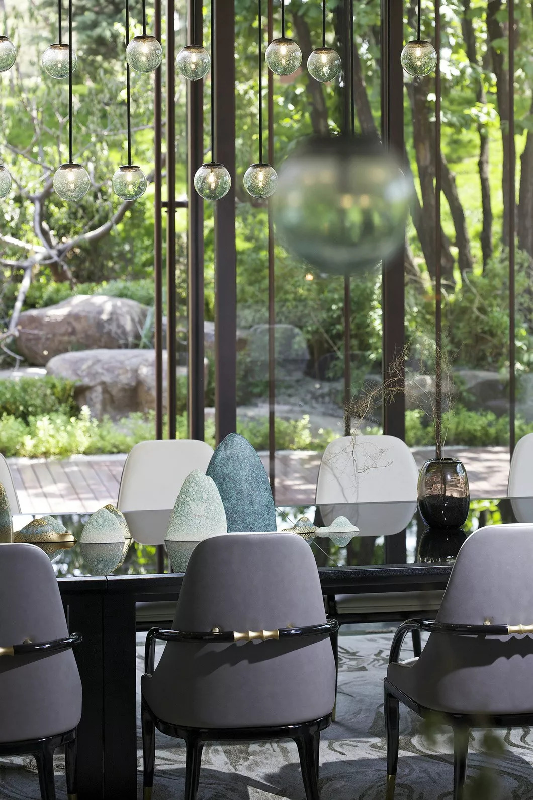 私宴与西餐这两个空间皆采用引景入室的手法,由景及人,以枯枝簇拥,绿植假山等营造室内桃花源,让室内室外形色统一,言有尽,而意无声。