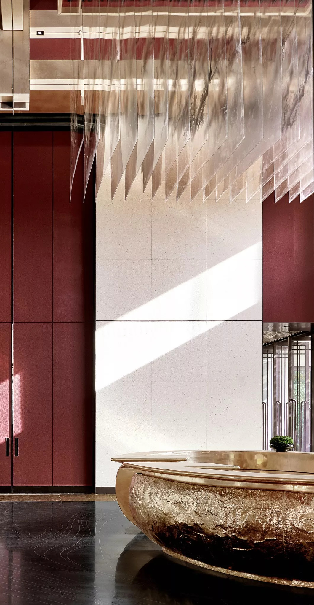 水吧区延续了整个空间的端庄雅致,用铜和镜面黑玻打造出一个弧形吧台,一抹红色让天花和墙面一气呵成,使得整体空间格局对称统一。