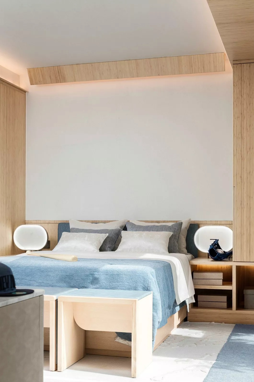 落地玻璃透着的风景,如自然变幻的四季画卷,再将光纳入设计思考的范畴,配合精心搭配的灰白色系的丝绸床品泛起的微微柔光,更显雅致与柔和;地毯上呼应的自然元素图案,宛若柔和的湖水倒影窗外的夕阳也婉转透露出清雅的气韵。