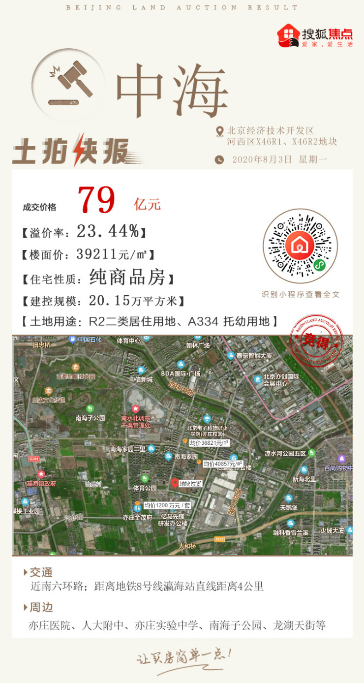 最终,经过数十轮角逐,亦庄河西区的X46R1、X46R2不限价商品房地块被中海以79亿拍得,成交总价跻身北京总价地块第六名,也刷新了大兴区域新高纪录。溢价率为23.44%,楼面价39211元/㎡,项目预计售价将超7万+。