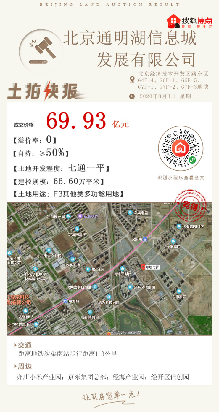 亦庄路东区的G4F-4、G6F-1、G6F-5、G7F-1、G7F-2、G7F-3多功能用地地块被北京通明湖信息城发展有限公司以69.93亿拿下。
