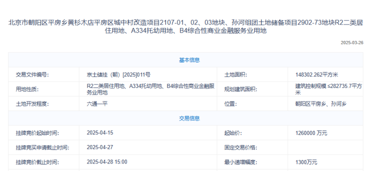 4 月 28 日,北京土拍市场即将迎来一场重磅对决。朝阳区平房乡与孙河组团地块以 126 亿元起拍价亮相,这不仅是朝阳区自去年以来推出的第四宗组团地块,更承载着市场对房地产行业复苏的深切期待。在当前楼市深度调整的关键节点,这场竞拍究竟会掀起怎样的波澜,又将为区域发展和行业走向带来哪些变革?