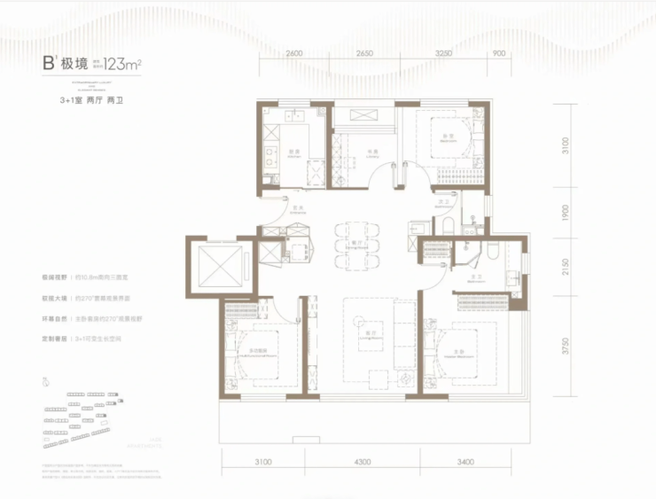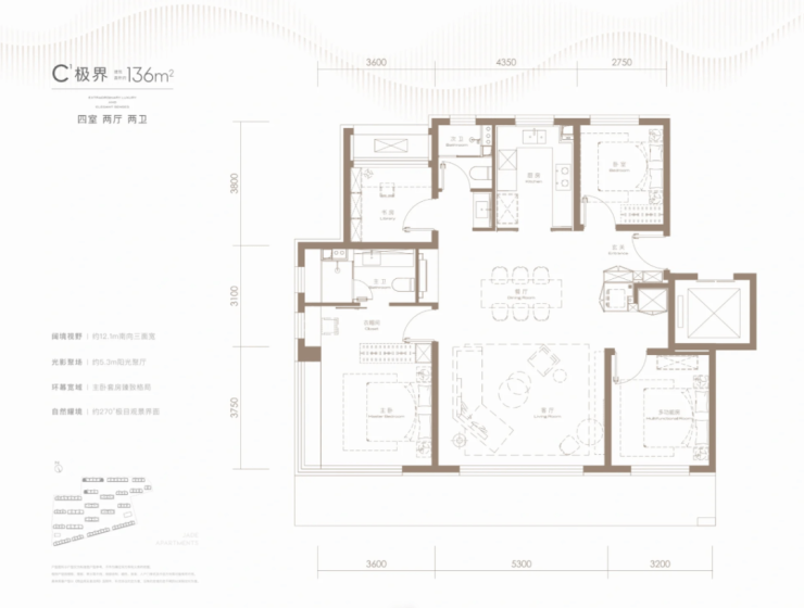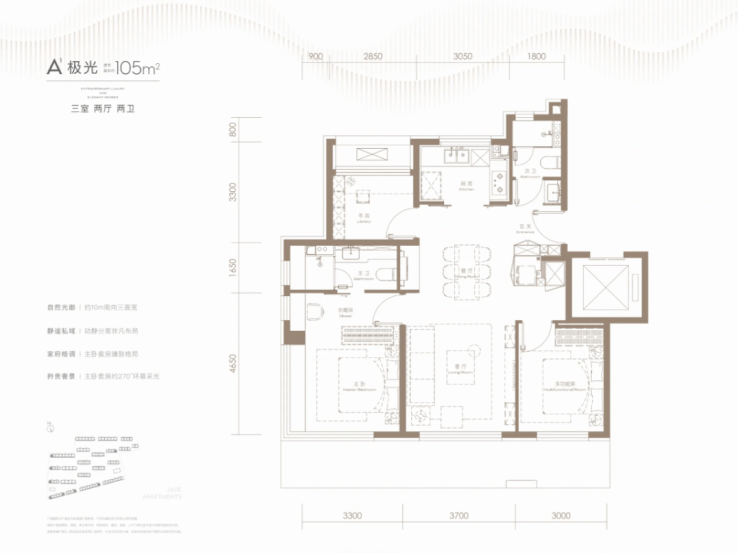 主卧拥有270°超大观景视野,和105相比多了个书房,也可以当作卧室,整个动线非常流畅,而且采光相当不错,两个卫生间都全明。