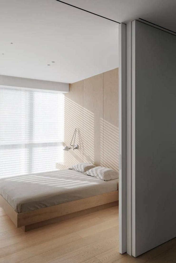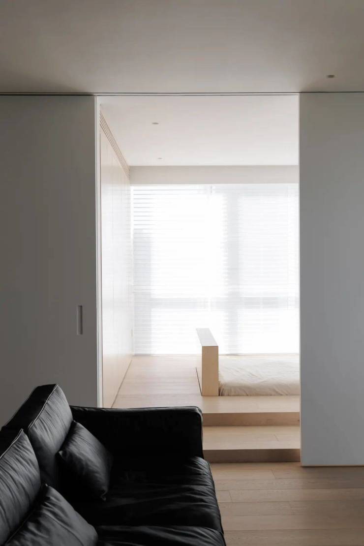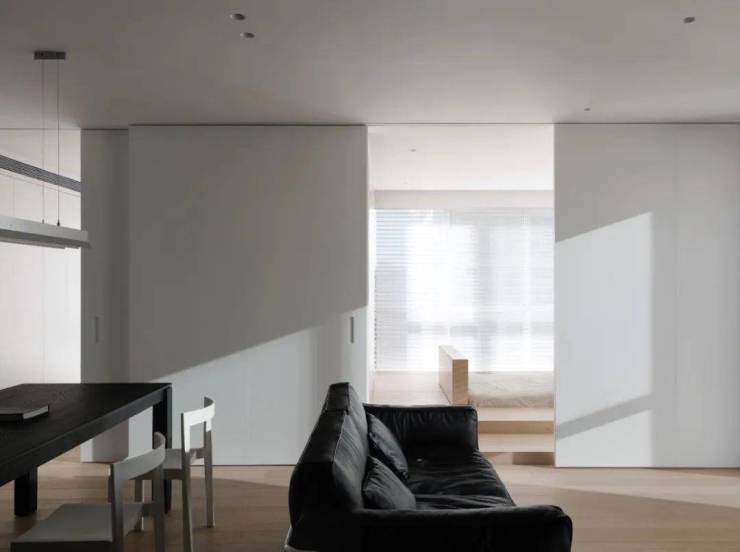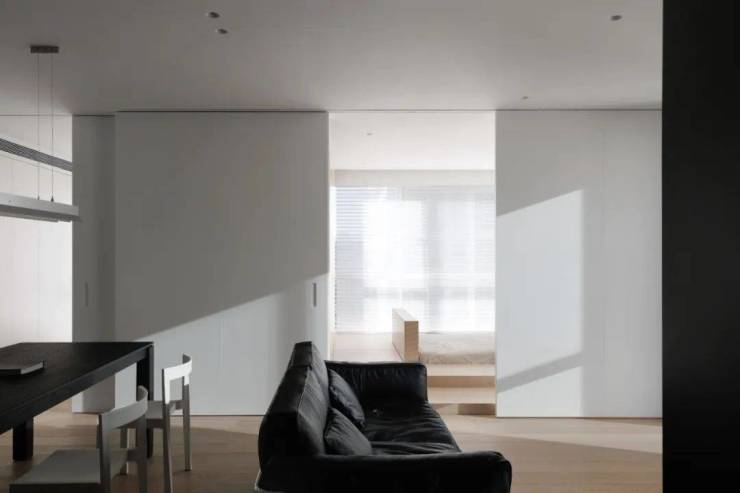 两个卧室由三扇移门与客厅空间分离,“可开可合”的空间设计是一种极具现代感和人性化的设计理念。通过可移动隔断、移门、隐藏式设计、光线调节以及风格的统一与变化,这种设计让空间在不同的生活场景中自由切换,为居住者创造出舒适、实用且充满活力的居住环境。