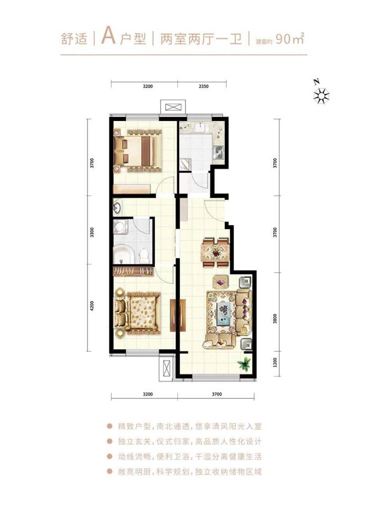 客厅、卧室朝南,加起来有6.9米的面宽,能吸收更多阳光,采光通透。