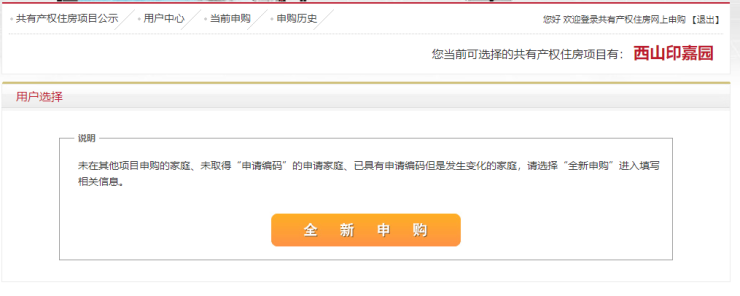 (2)如购房家庭信息发生变化(如年龄、婚姻状况、户籍变更等情形)或首次进行共有产权住房申购的家庭请选择“全新申购”操作。