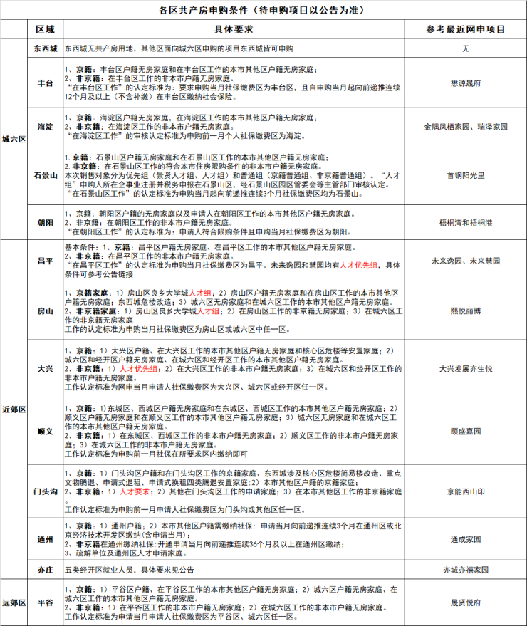 同一个区的不同项目要求也会不同,会根据现实情况调整,但基本条件很少变动,比如昌平个别项目会有人才优先组,但是有昌平户口或昌平社保都可以申购,只不过优先级靠后,且昌平没有向其他区放开。