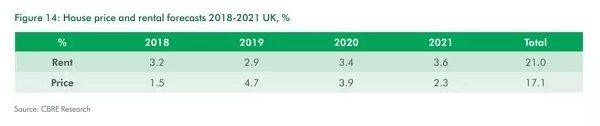 根据CBRE的预测报告,英国房价将在2019年上涨1.8%,租金上升2.3%;到2020年,英国房价将上涨2.3%,租金上涨1.9%。