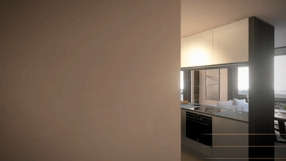 公寓室内部设计简约优雅、理念独特,巧妙的实现了视觉及空间的双重较大化,透过巨幕落地窗,明亮的光线自云端之上照亮了整个居室。精挑细选的家装材质,为住户营造温馨舒适的空间,每户单元都配置一体式电器,提供便捷生活体验。