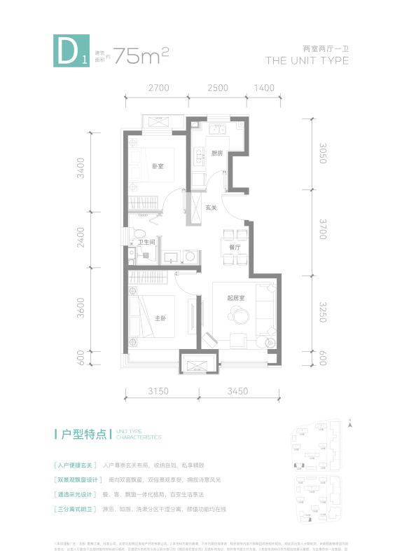 75㎡两居,南北通透,采用动静分区的形式,拥有两个宽景飘窗。U型厨房、明卫干湿分离、独立家政洗漱区,做到合理运用每一寸空间,没有面积浪费。