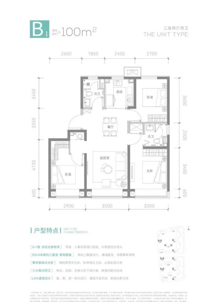 100㎡三居,是最方正的户型,也是热门户型。三面宽朝南,LDK一体化布局,双明卫设计,空间动线流畅,空间舒适度接近满分,比较推荐想一步到位的改善家庭。