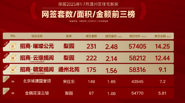 根据天朗房研网最新统计,2025年1月-7月的榜单中,招商三子持续霸榜通州,旗下招商云璟揽阅、招商璀璨公元、招商朝棠揽阅,在成交套数、面积,金额三大榜项上稳坐前三位。
