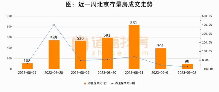 从存量房来看,2023年09月02日北京存量房单日成交98套,比昨日减少293套,环比下降74.9%。从近一周存量房成交来看,北京存量房日均成交套数为442套,09月02日单日成交98套,低于近一周平均水平77.8%。