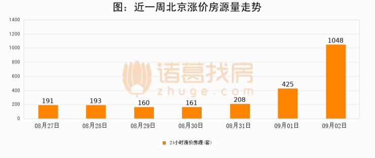 根据诸葛找房数据显示,北京24小时涨价房源量为1048套,较09月01日增加623套,环比上涨146.6%。与此同时,涨价房源占比小幅扩大,业主信心有所提升。