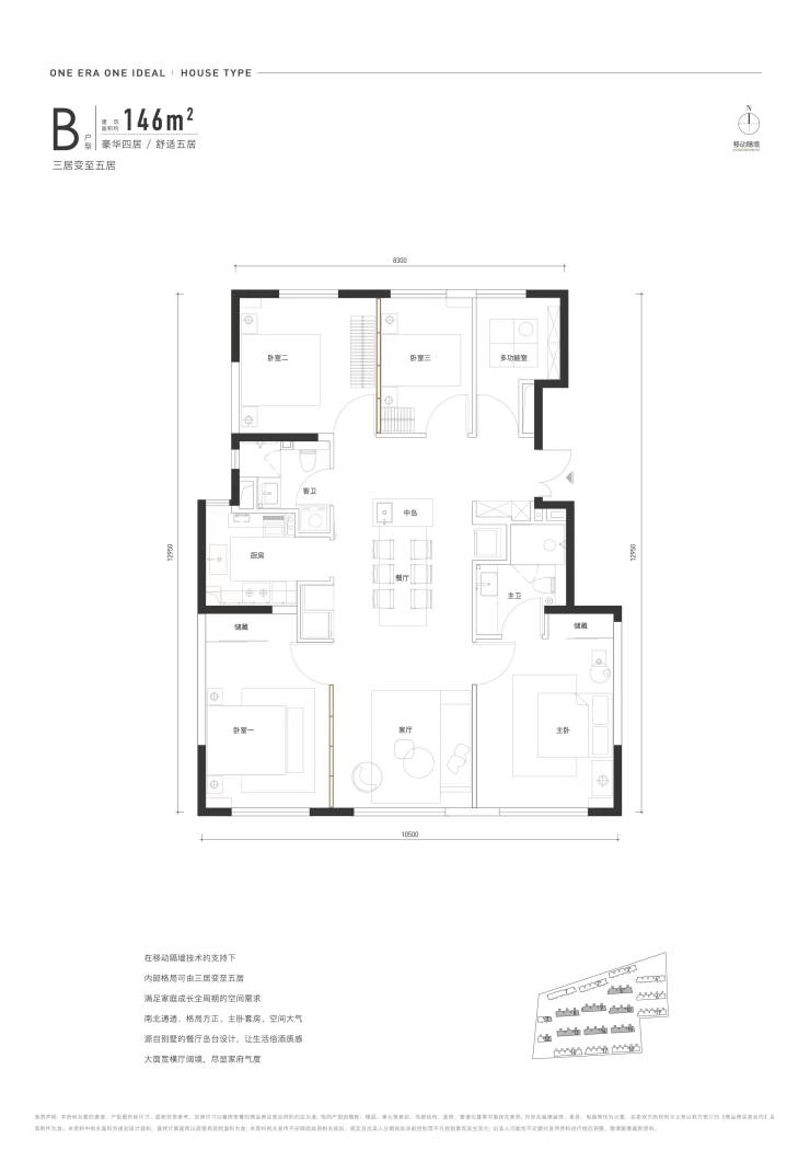 146平可变五居室,这个户型十分方正,南向面宽10.5米,三面宽朝南,主卧依然是套房设计,且主卫很宽敞,北向小卧室和多功能室可以根据需求打通,变成一个大卧室,可变性很高,厨房U型设计,存储空间很大,餐厅可以容纳六人位,亲戚朋友来聚餐也完全坐的开,十分宽敞,适合多人口家庭居住。