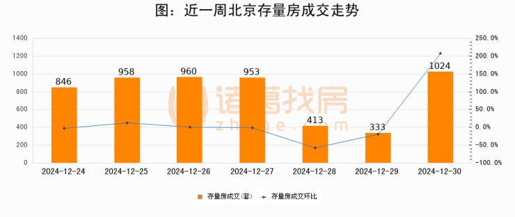从存量房来看,2024年12月30日北京存量房单日成交1024套,比昨日增加691套,环比上涨207.5%。从近一周存量房成交来看,北京存量房日均成交套数为783套,12月30日单日成交1024套,高于近一周平均水平30.8%。