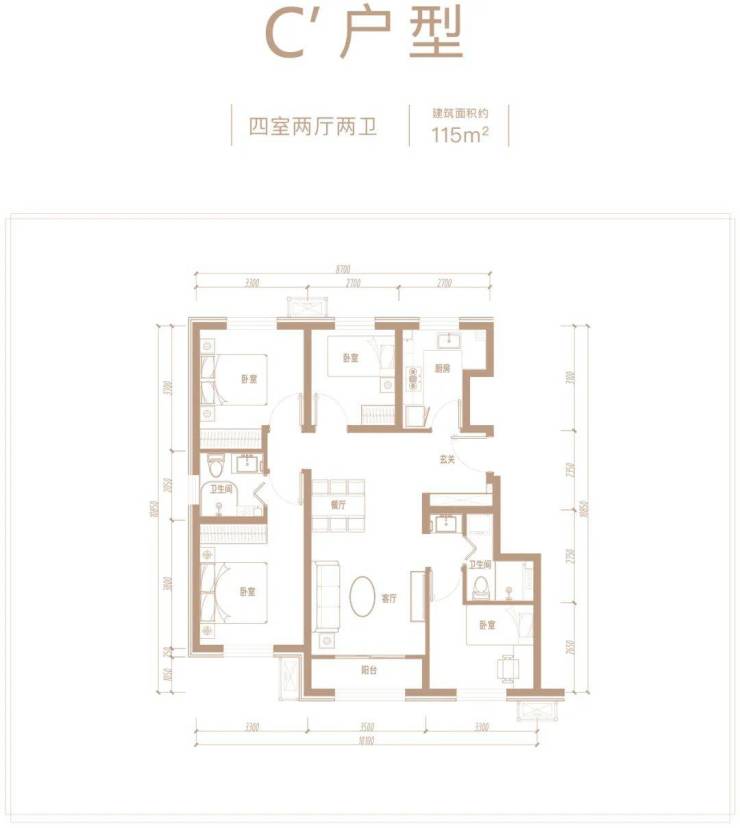 建面约115平米四居,3+1户型设计。
