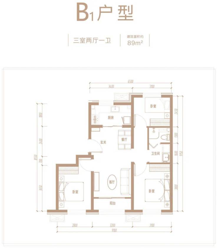 建面约89平米三居,南向三面宽,方正通透。